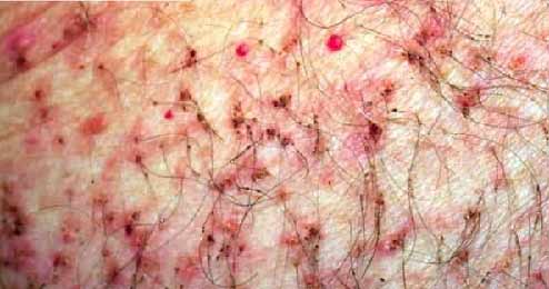 (2)皮疹 在阴虱叮咬处常有微孔(肉眼看不见),局部发红,有小红斑点,其上有血痂;微孔处约经5天,局部产生过敏反应,常隆起出现丘疹。因搔抓常出现感染,见脓疱、渗液、结痂。经搔抓往往继发湿疹或毛囊炎。